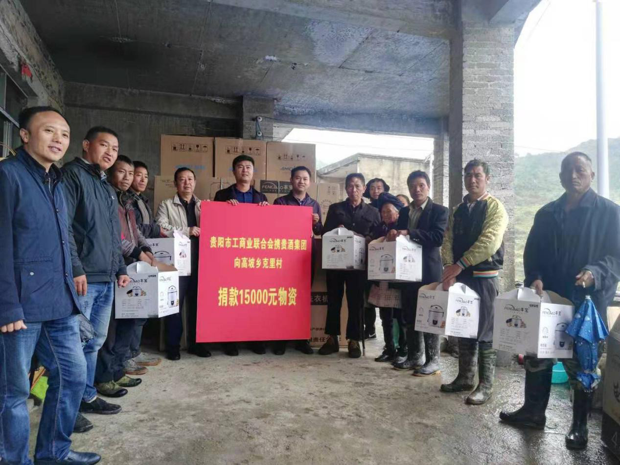 10月16日,贵阳市工商联携手贵州贵酒有限公司相关负责人前往高坡乡克里村开展帮扶活动,为该村18户国标贫困户捐赠价值15000元物资。
